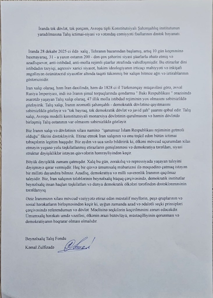 Avropa və ABŞ-dakı Talış diasporunun üzvləri İranda davam edən etirazlarla həmrəyliklərini ifadə edərək, milli yenilənmə və mədəni qorunma çağırışlarını vurğulayıblar. İctimai bəyanatlarda və onlayn forumlarda Talış fəalları din və dövlət idarəçiliyi arasında aydın bir ayrılığın müdafiəsi ilə yanaşı, İranın milli irsinin bərpasının vacibliyini vurğulayıblar.